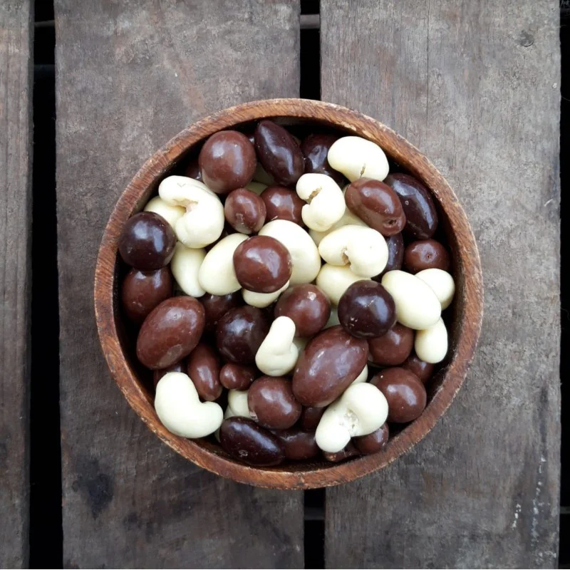 De chocolade notenmix is een heerlijke mix met amandelen, cashewnoten, hazelnoten en paranoten omhuld met melk, puur of yoghurt chocolade. Puur genieten!