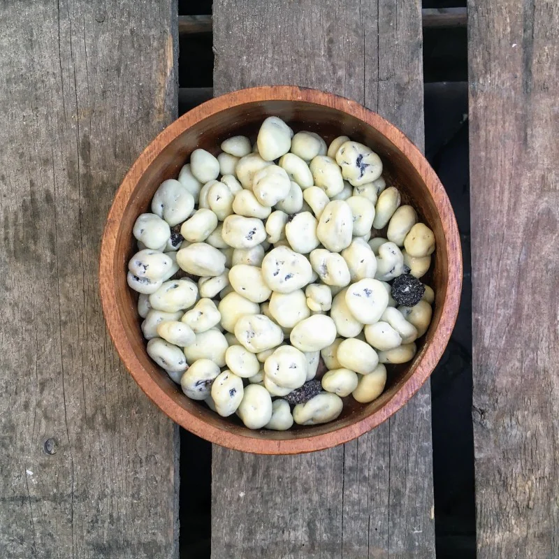 Wat een heerlijke traktatie voor jong en oud: grote rozijnen omhuld met yoghurt.