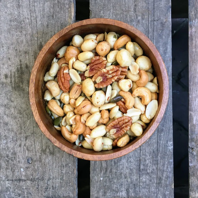 Deze mix bestaat uit grote pinda’s, cashewnoten, pecannoten, macadamia’s en een klein beetje pepitapitten.