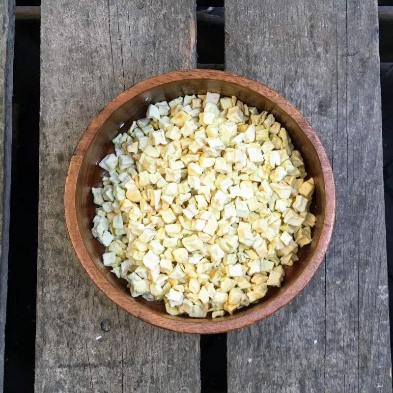 De gedroogde appelblokjes zijn ideaal om mee te bakken, maar ook erg lekker om door overnight oats te doen!