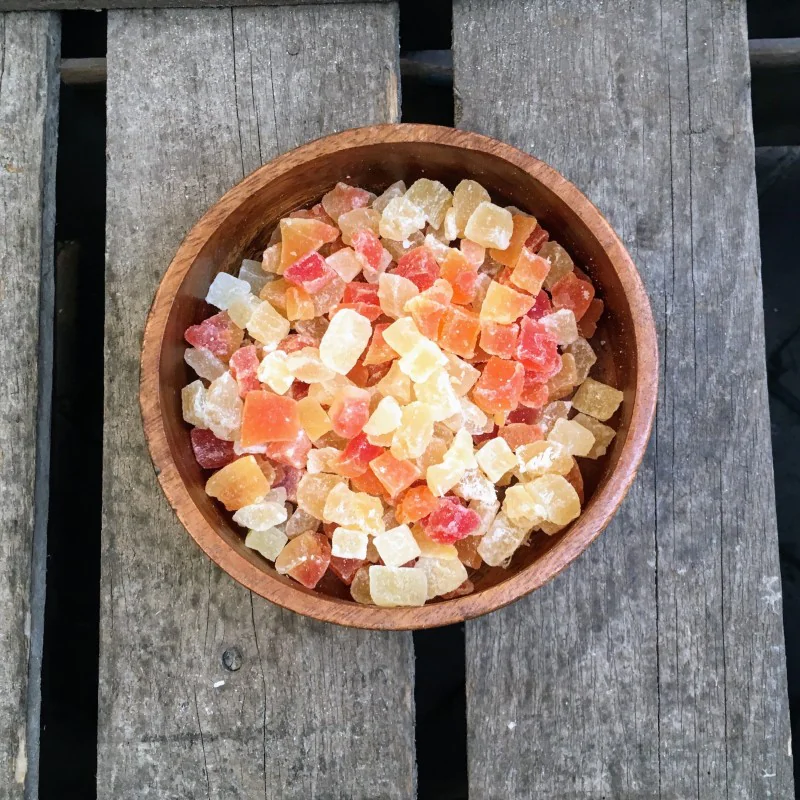 Ananas, Papaja, Suiker, Voedingszuur (E330), Conserveermiddel (E223) (sulfiet)